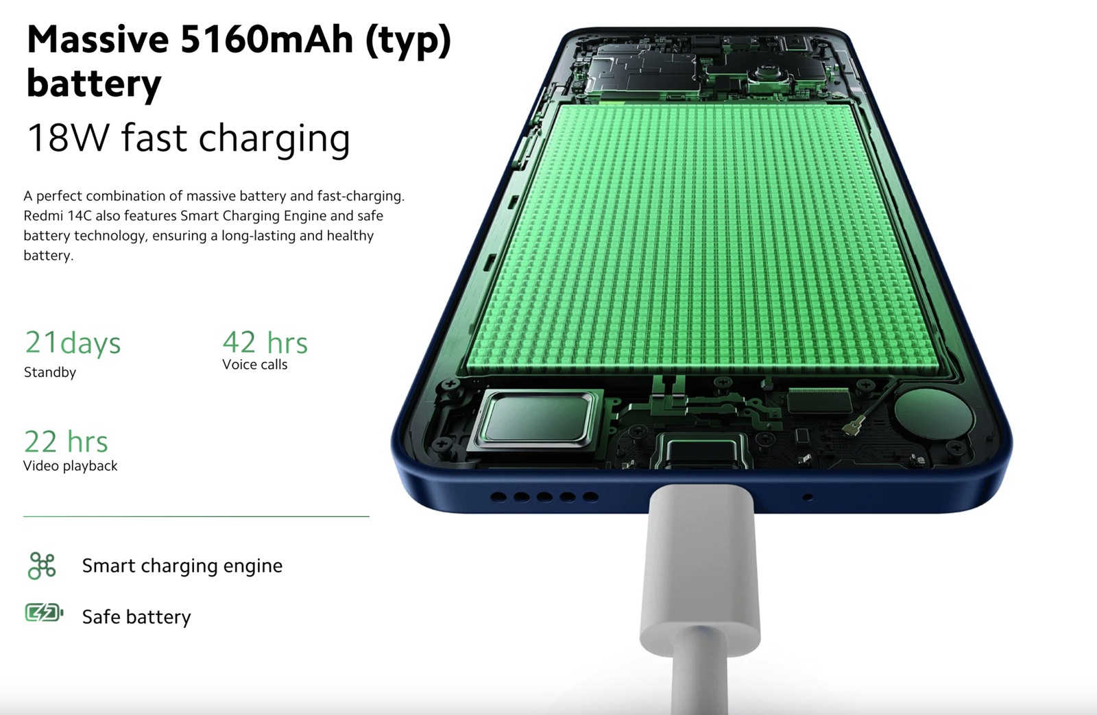 One of the standout features of the Redmi 14C is its robust 5160mAh battery, which supports 18W fast charging via USB Type-C. While the device does not include a power adapter in the box, Xiaomi recommends using an 18W adapter compatible with PD charging to maximize charging efficiency.
